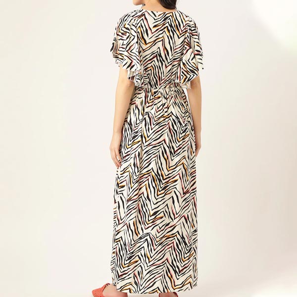 White and Black printed woven Maternity maxi dress with ruffles, has a V-neck, short sleeves, zip closure, and flared hem
